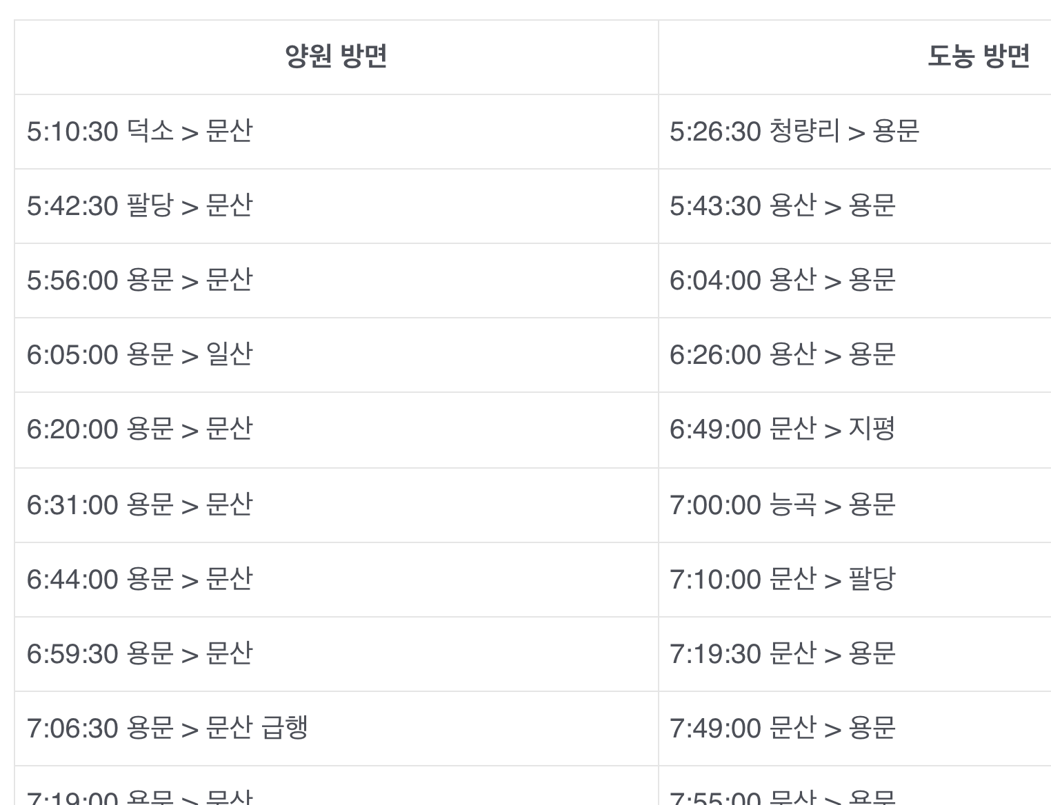 구리역 경의중앙선 시간표 평일 시간표 휴일 시간표