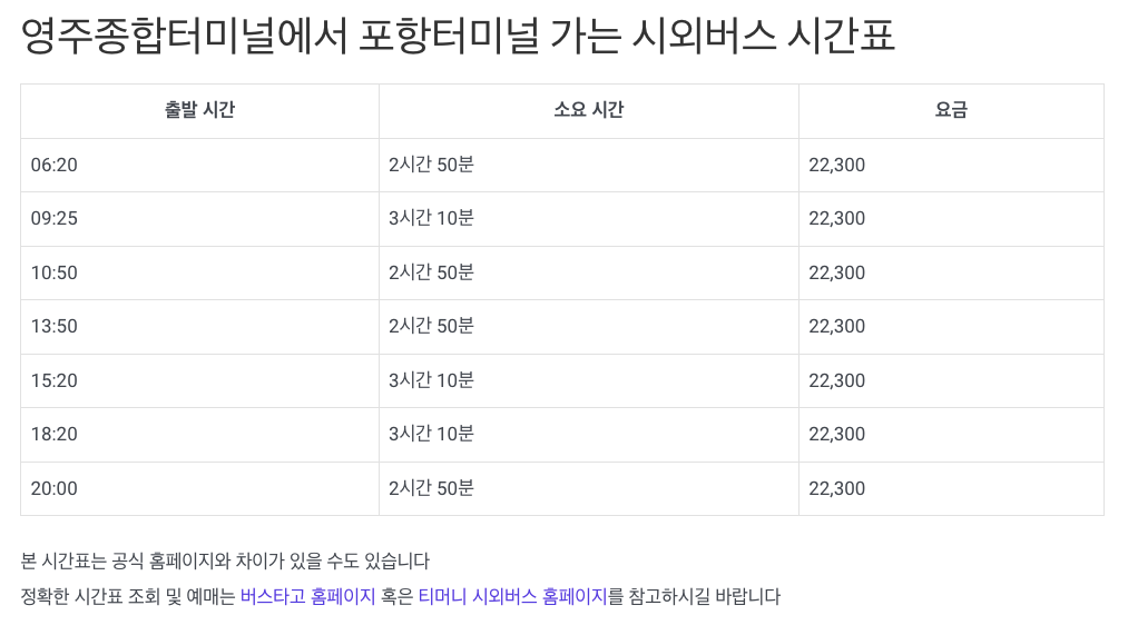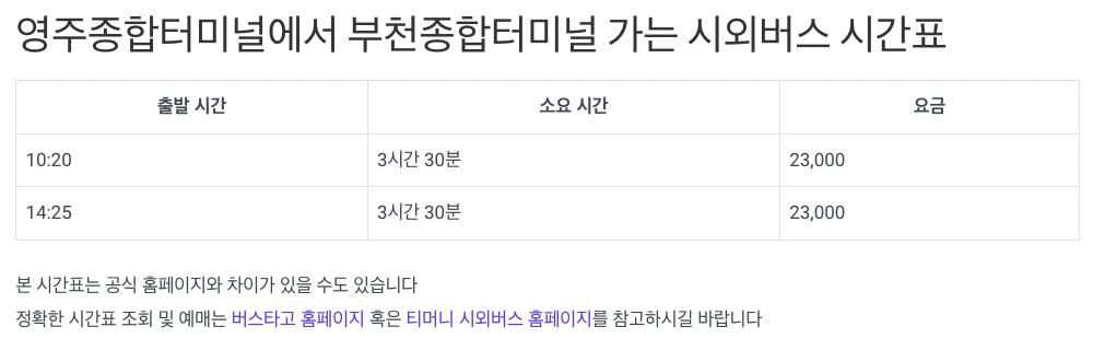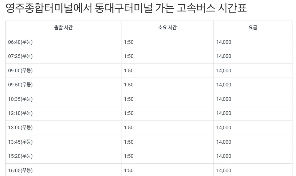 영주터미널 시간표는 위 페이지에서 조회 가능합니다