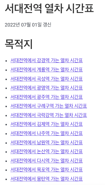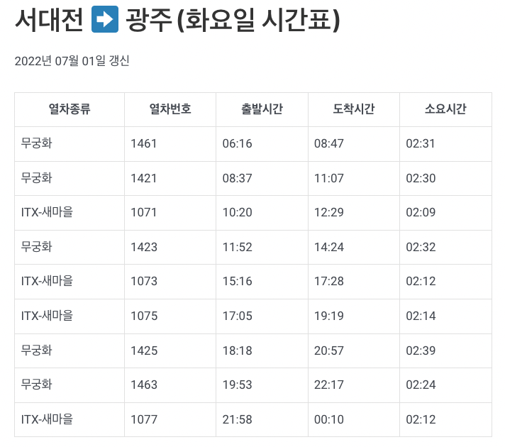 위와 같이 서대전역에서 갈 수 있는 역들의 시간표를 제공하고 있습니다.