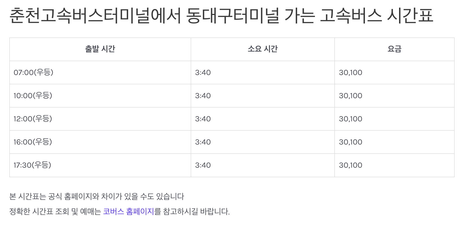 춘천 고속버스터미널 시간표