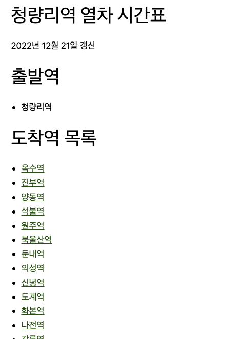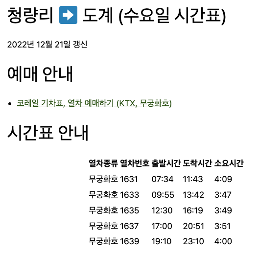 2022년 12월 09일 청량리역 시간표, 예매 안내입니다.