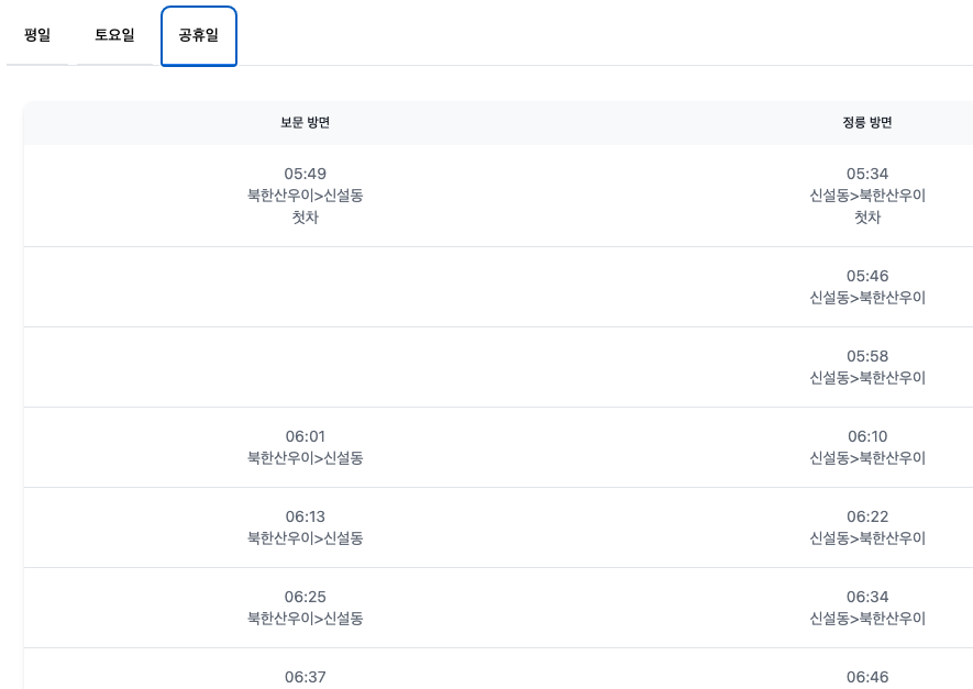 시간표는 평일이랑 공휴일이랑 나뉩니다.