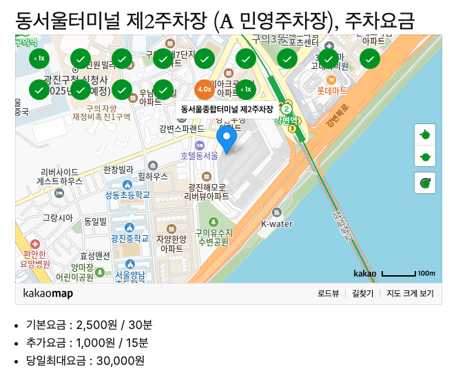 동서울종합터미널에는 제1 주차장과 제2 주차장이 있으며, 각각의 주차장은 터미널 이용객들이 편리하게 접근할 수 있도록 배치되어 있습니다. 주차장은 터미널의 주요 출입구와 가깝게 위치하여, 버스를 이용하는 승객들이 차량을 주차한 후 쉽게 터미널로 접근할 수 있습니다.