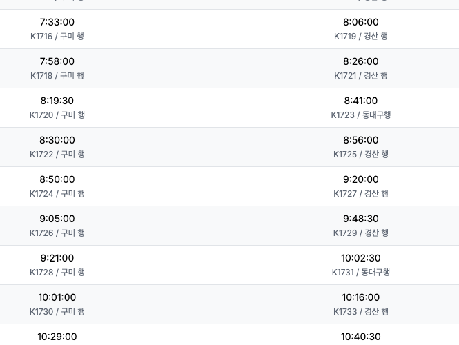 대경선 서대구역의 상·하행선 시간표를 요일별로 확인하세요. 열차 번호, 출발 시각, 방면 등 상세 정보 제공.